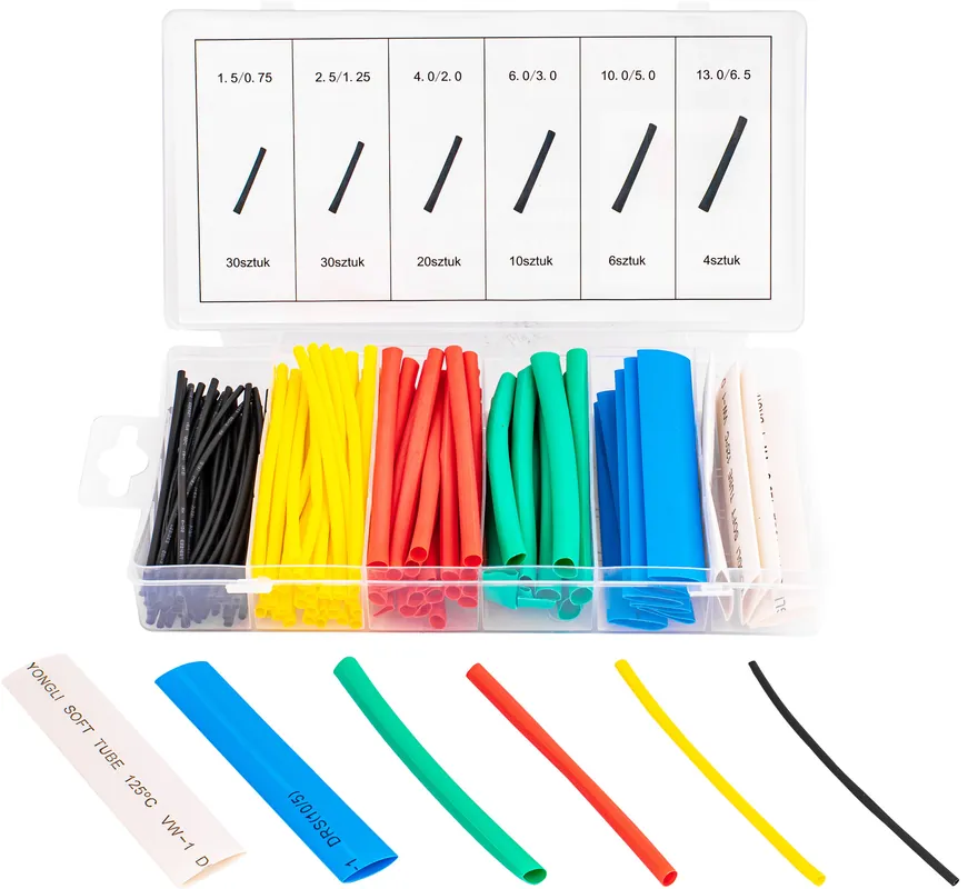 W skład zestawu wchodzi 196 sztuk rurek termokurczliwych w 6 popularnych rozmiarach.