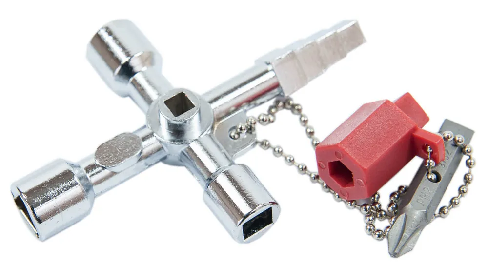 Uniwersalny klucz wyposażony w końcówki do otwierania i zamykania większości popularnych systemów skrzynek oraz szaf sterowniczych.