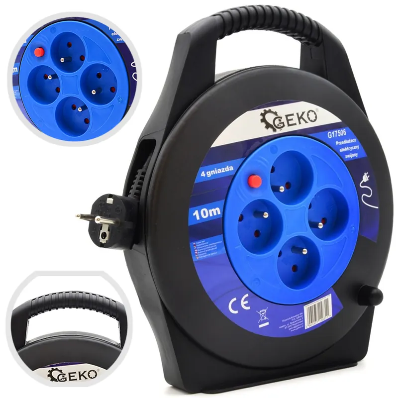 Bęben osadzony na solidnym metalowym stelażu z ergonomiczną rękojeścią. Rączka umieszczona przy krawędzi bębna przyspiesza zwijanie, a gumowy element przymocowany do przewodu kilka centymetrów przed wtyczką umożliwia zaczepienie go np. do krawędzi bębna, co znacznie ułatwia przechowanie i transport zwiniętego przedłużacza.