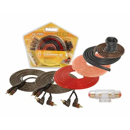 Zestaw do montażu wzmacniacza samochodowego LX Z003 Bardzo elastyczne przewody. Kabel zasilający czerwony 6GA(12mm2) Długości 6m. Kabel masowy brazowy 6GA(12mm2) Długości 1.2m Kabel połączeniowy z żyłą sterującą 2 RCA Długości 5 m Kabel głośnikowy 12 GA Długości 6 m Konektorki do montażu Oprawa bezpiecznika AGU Bezpiecznik AGU 60a Opaski zaciskowe