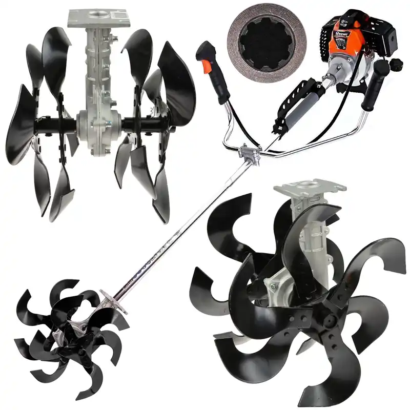 Przystawka do kosy spalinowej – glebogryzarka umożliwia spulchnianie i napowietrzanie gleby w celu przygotowania podłoża pod uprawę roślin.