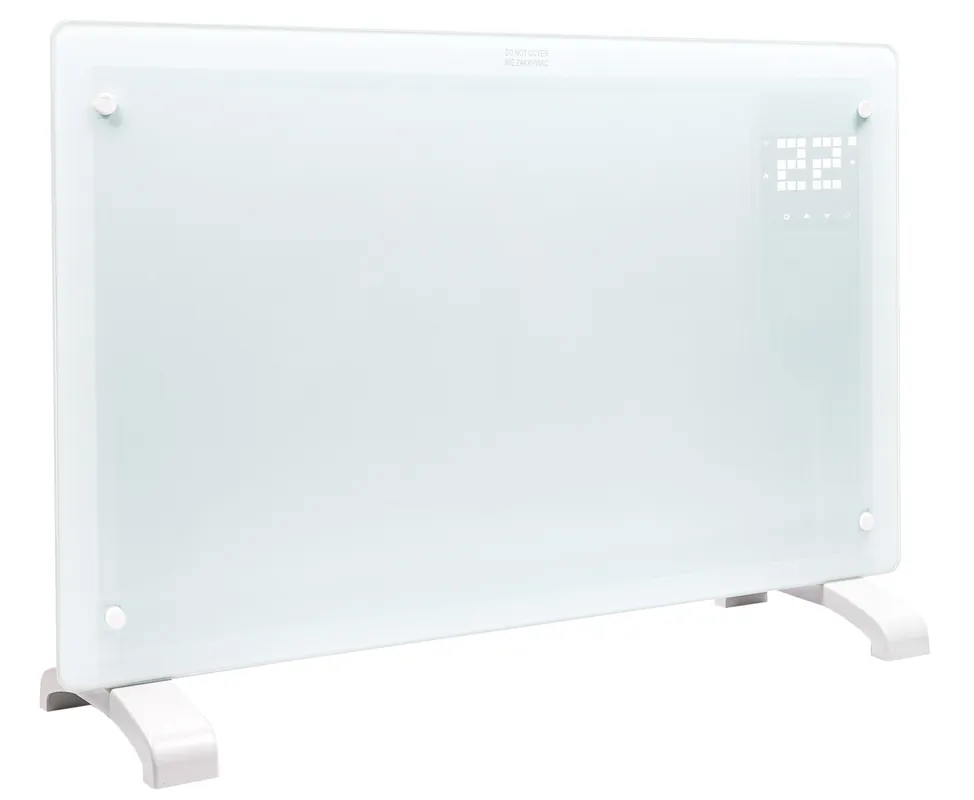 TERMOGLASS PRO 2000W SMART to nowoczesny energooszczędny grzejnik z eleganckim wykończeniem w postaci szklanych frontów, w kolorze białym.