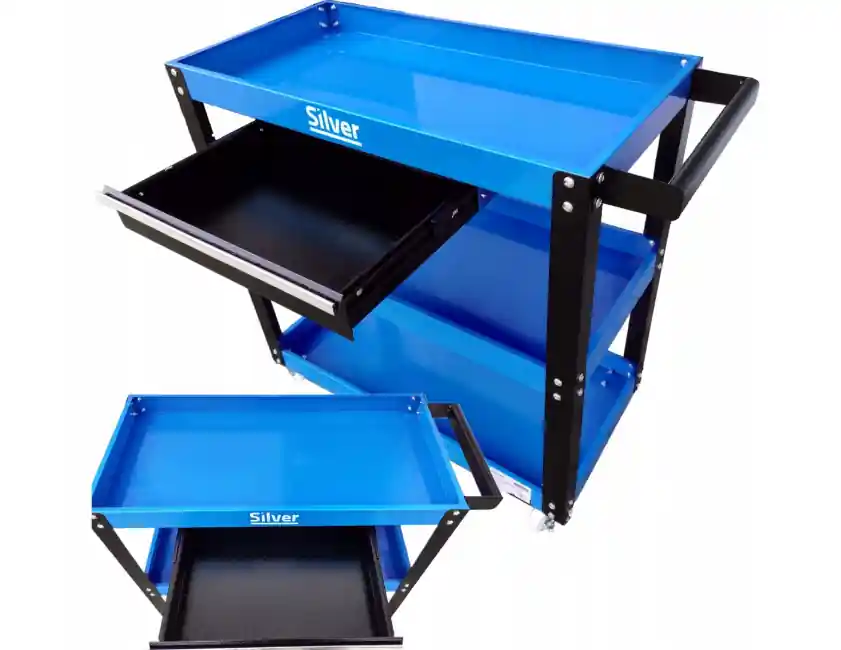 SZAFKA WÓZEK ZESTAW WARSZTATOWY NARZĘDZIOWY SKRĘTNE KOŁA 3 PÓŁKI + HACZYKI SILVER