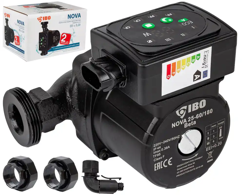 ENERGOOSZCZĘDNA POMPA ELEKTRONICZNA CYRKULACYJNA OBIEGOWA DO PIECA C.O. BETA NOVA 25-60/180 IBO POMPY + ŚRUBUNKI DO INSTALACJI C.O. + WTYCZKA KĄTOWA