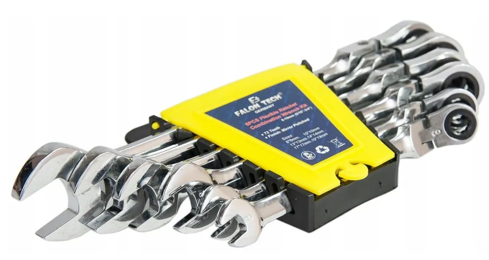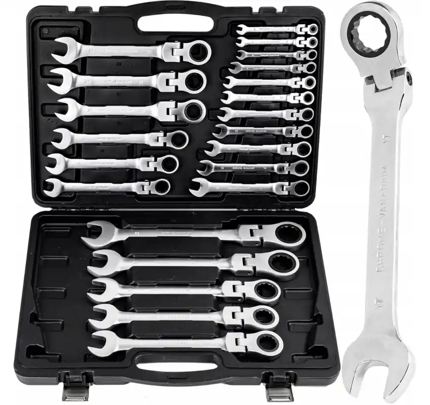 KLUCZE PŁASKO OCZKOWE Z GRZECHOTKĄ ŁAMANE 8-19 mm 6 SZTUK SILVER
