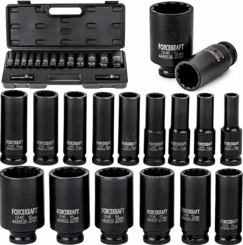 ZESTAW NASADKI UDAROWE GŁĘBOKIE DO KLUCZY PNEUMATYCZNYCH 10-36 mm 1/2″ 12 K 15el FORCEKRAFT