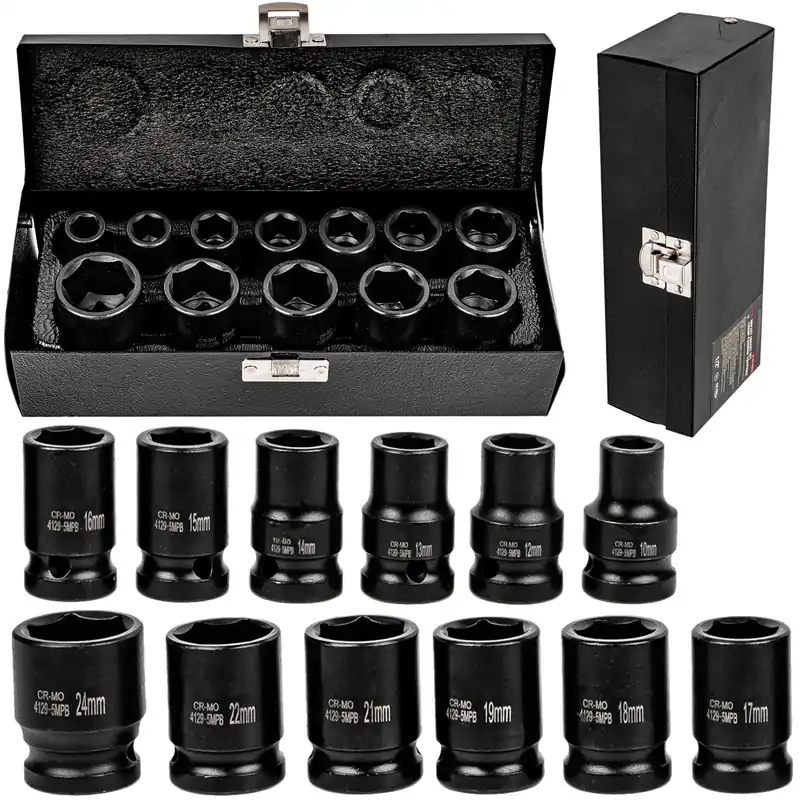 • Zawiera sześciokątne nasadki udarowe krótkie i długie w popularnych rozmiarach od 10 do 24 mm.