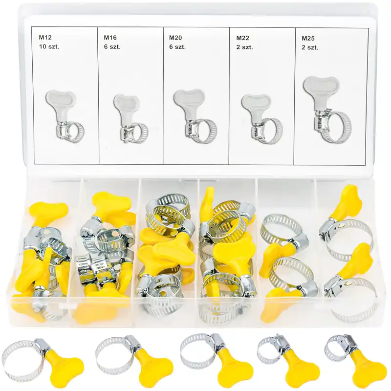 Zestaw opasek sprężynowych w najpopularniejszych rozmiarach, pasujących do węży powietrznych, wodnych, paliwowych itp.