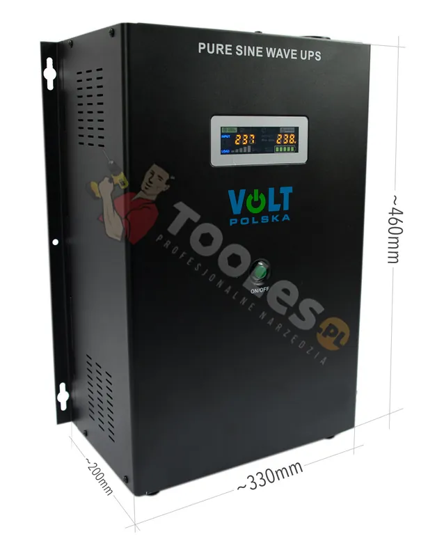 Ten model przetwornicy VOLT POLSKA sinusUPS został specjalnie skonstruowany do awaryjnego zasilania różnych urządzeń. Idealnie nadaje się do awaryjnego zasilania pieca centralnego ogrzewania lub z kominkiem z płaszczem wodnym. Podłączenie przetwornicy jest bardzo proste. Przetwornice należy podłączyć do gniazdka z prądem zmiennym 230V, do przetwornicy wyjście (OUTPUT) 230V AC podłączamy, np. piec CO bądź inne urządzenie. Podczas, gdy napięcie jest w sieci, przetwornica dzięki wbudowanemu prostownikowi, ładuje akumulator o pojemności 55Ah prądem 3A. Kiedy nastąpi zanik napięcia, przetwornica automatycznie przejmuje kontrole i piec CO jest nadal zasilany. Kiedy napięcie pojawi się ponownie, przetwornica przechodzi w stan ładowania lub doładowywania akumulatora, natomiast piec jest zasilany z gniazdka 230V.