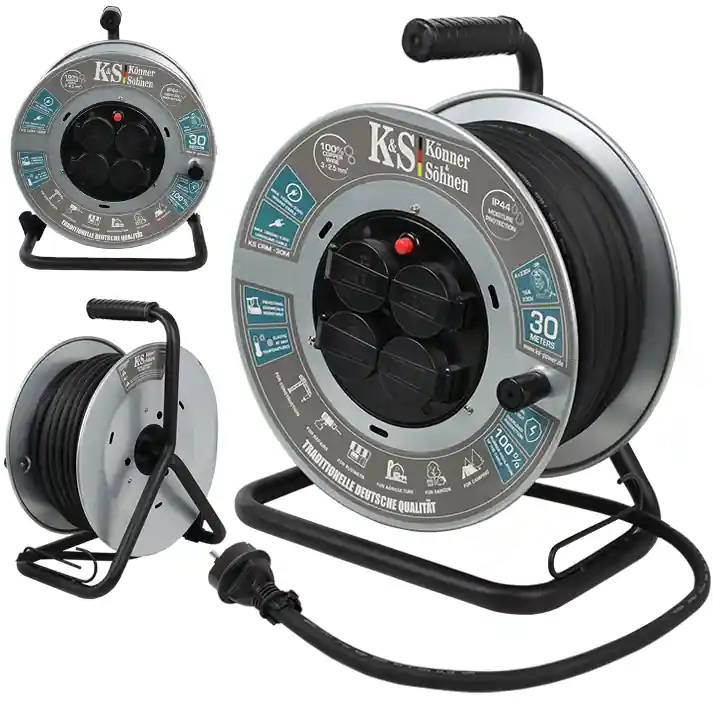 Przedłużacz 4-gniazdowy z uziemieniem, wyposażony w metalowy stelaż, na który nawinięty jest przewód 3 żyłowy o średnicy 1 mm². Przewód posiada grubą gumową izolację H05RR-F o wysokiej odporności na uszkodzenia mechaniczne, czynniki atmosferyczne, substancje chemiczne (oleje chłodząco-smarujące, benzyna, alkohole etylowe, metylowe). Korpus i bęben wykonane z lekkiego i wytrzymałego tworzywa.
