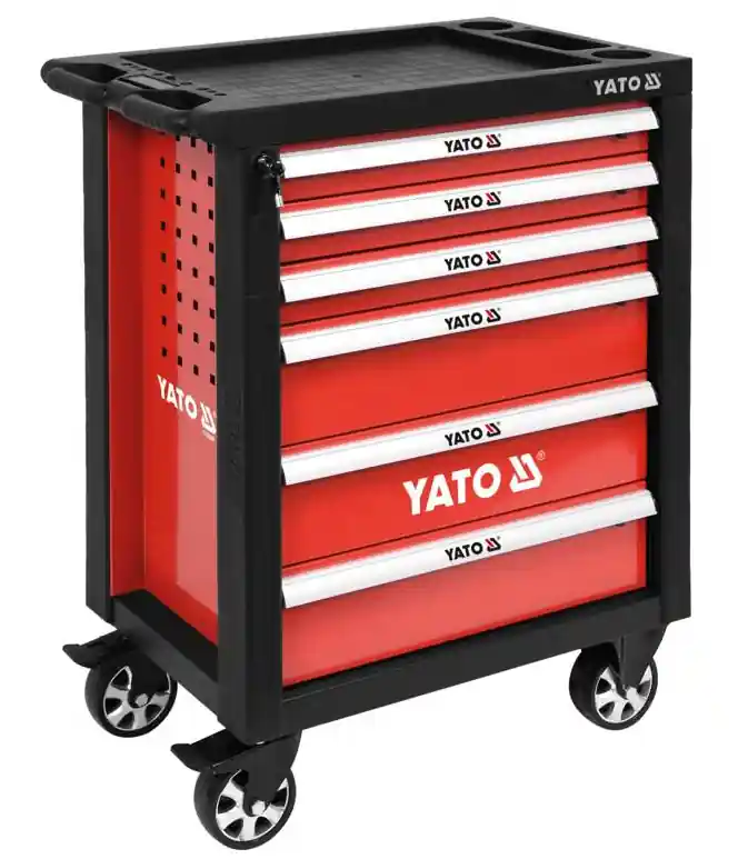 Szafka serwisowa z narzędziami marki YATO. Posiada 6 szuflad na prowadnicach kulkowych.