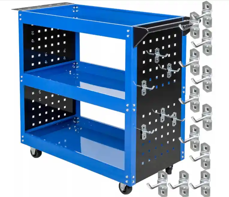 SZAFKA WÓZEK ZESTAW WARSZTATOWY NARZĘDZIOWY SKRĘTNE KOŁA 3 PÓŁKI + HACZYKI FALON-TECH