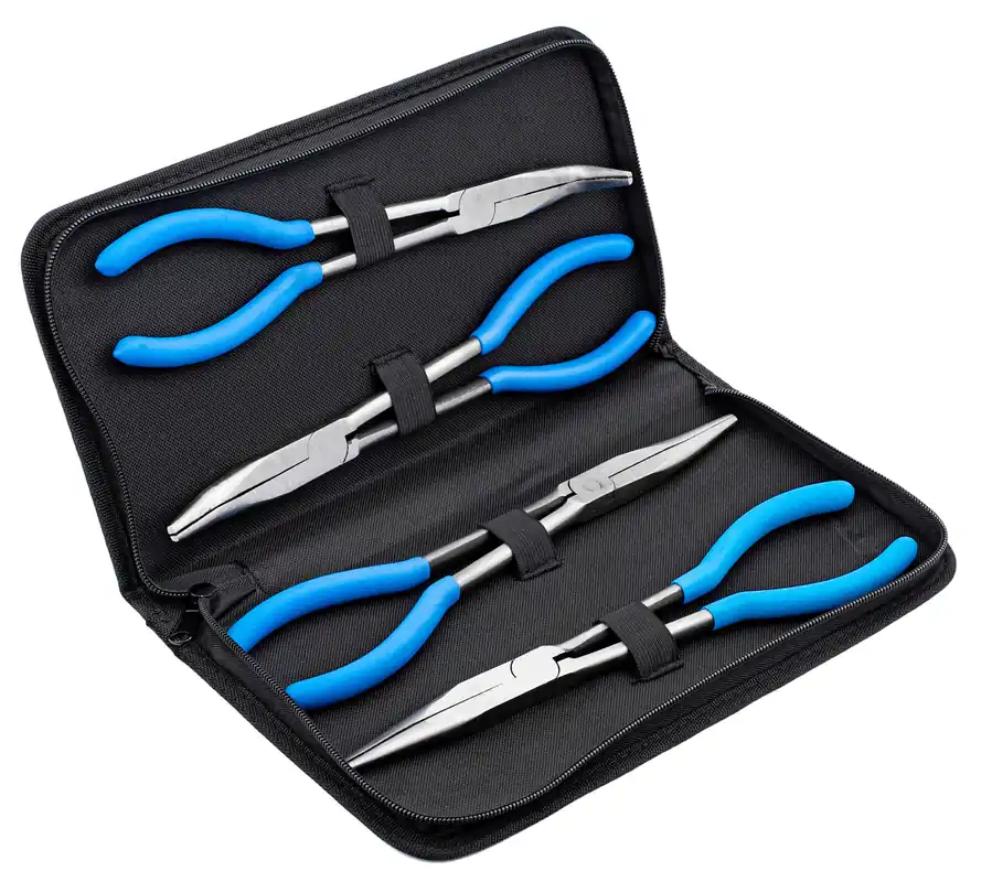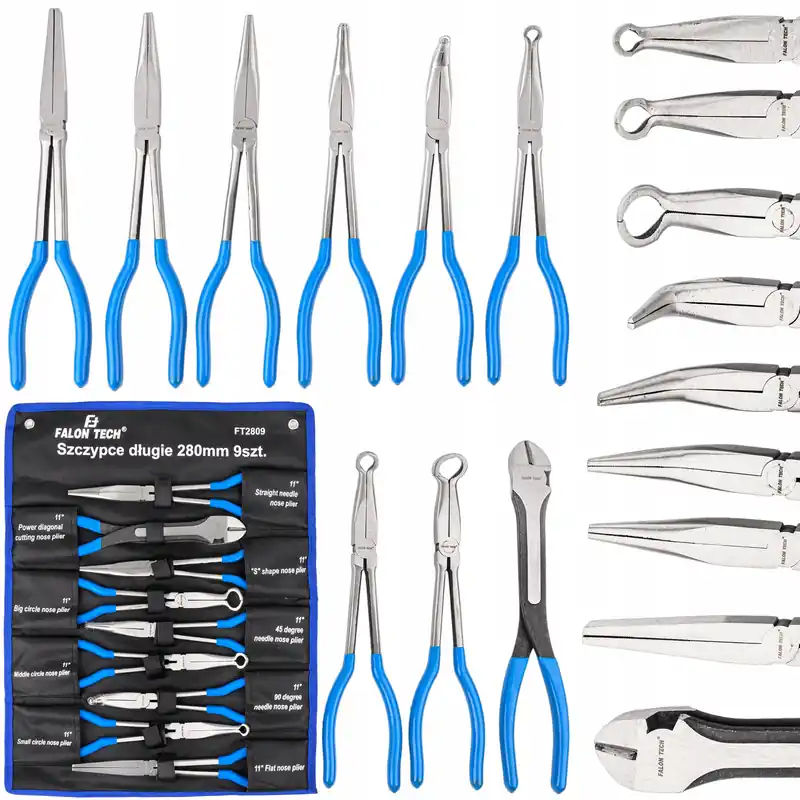 Zestaw 4 szczypiec długich 280 mm, proste, płaskie, zakrzywione, obcinaczki, do przewodów zapłonowych, o nachyleniu  90 ° – 0 ° – 20 ° – 45 °.
