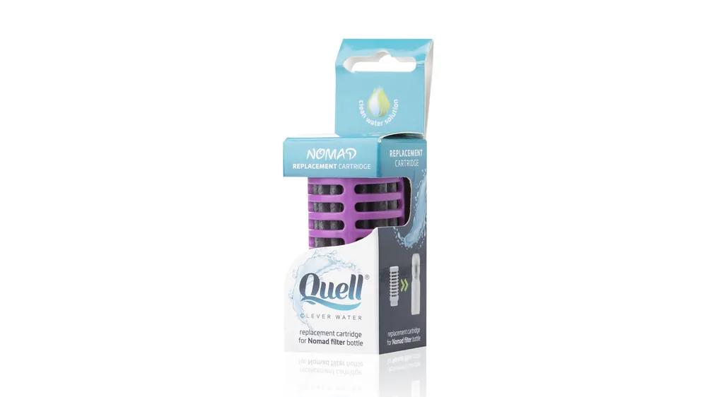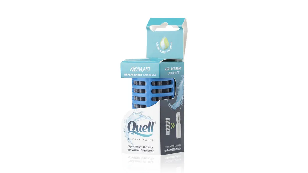 Filtr można łatwo i szybko wymienić. Jest dostępny w różnych kolorach. Wydajność filtra: 300 napełnień, w zależności od czystości wody wlewanej do bidonu Quell Nomad.