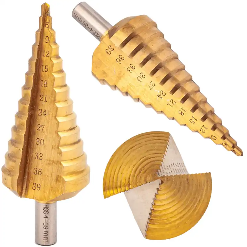 Bardzo wysokiej jakości wiertło stopniowe stożkowe, wykonane z wysokogatunkowej stali szybkotnącej hss + tytan.