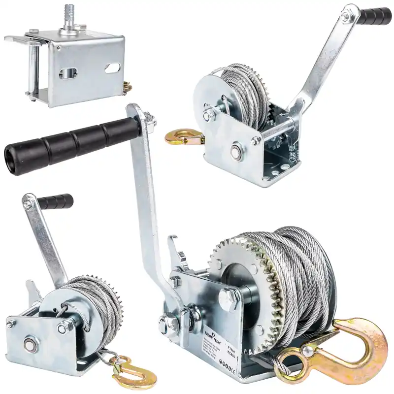Wyciągarka została wykonana z wysokiej jakości materiałów o odpowiedniej trwałości – stal konstrukcyjna, olewane haki ze sprężynami zwrotnymi.