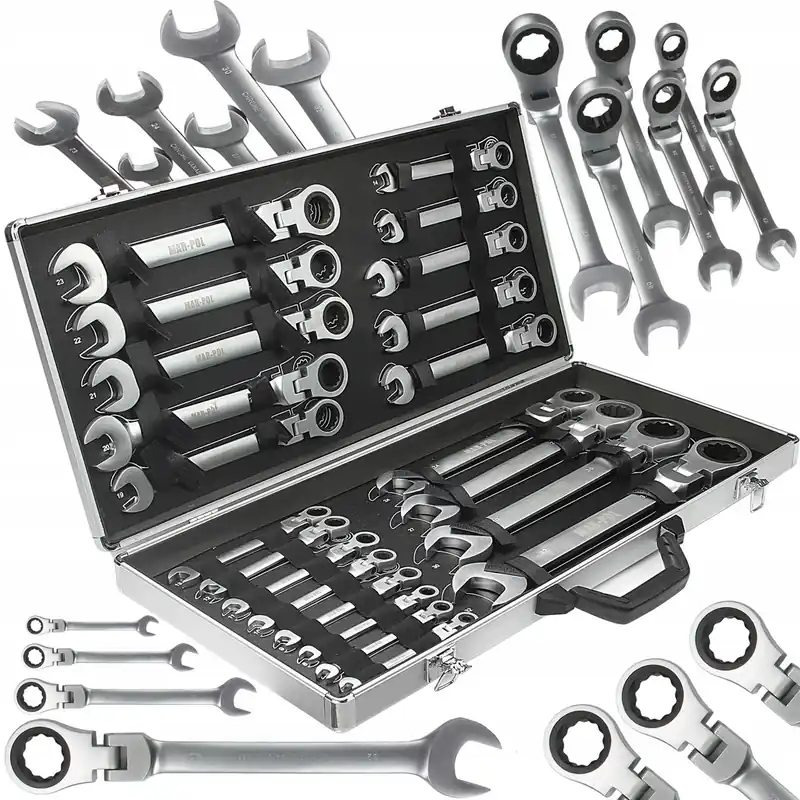 Zestaw kluczy łamanych płasko-oczkowych z grzechotką (72 zęby) wykonane są z wytrzymałej stali chromowo- wanadowej CrV. W zestawie znajdują się wszystkie, najbardziej popularne rozmiary kluczy. Klucze świetnie sprawdzają się w profesjonalnych serwisach i warsztatach samochodowych jak również w przydomowych garażach.