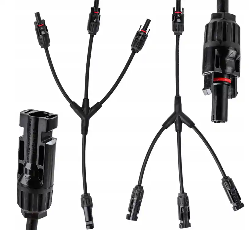 Zestaw konektorów typu Y, do zastosowania w instalacjach fotowoltaicznych, np. w przypadku połączeń pomiędzy poszczególnymi panelami fotowoltaicznymi.