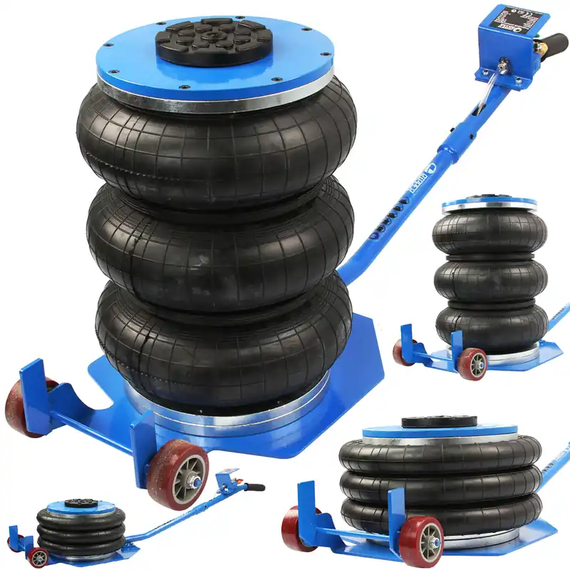 Konstrukcja oparta na trójpoziomowych miechach gumowych z wytrzymałego kauczuku zapewnia stabilną pracę i dużą odporność na intensywne użytkowanie. Długa rączka ułatwia manewrowanie podnośnikiem, a kółka pozwalają łatwo wsunąć go pod pojazd.