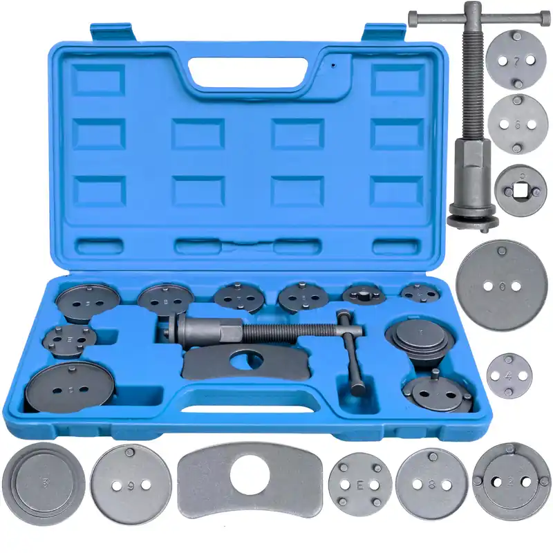 Profesjonalny 12 elementowy zestaw do cofania / wyciskania tłoczków w cylinderkach układów hamulcowych, niezbędny przy naprawach pojazdów wyposażonych w hamulce tarczowe.