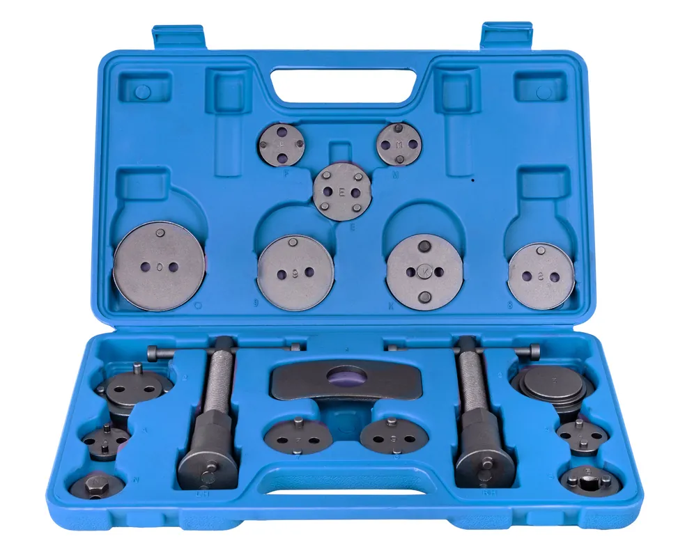 Profesjonalny 18 elementowy zestaw do cofania / wyciskania tłoczków w cylinderkach układów hamulcowych, niezbędny przy naprawach pojazdów wyposażonych w hamulce tarczowe.