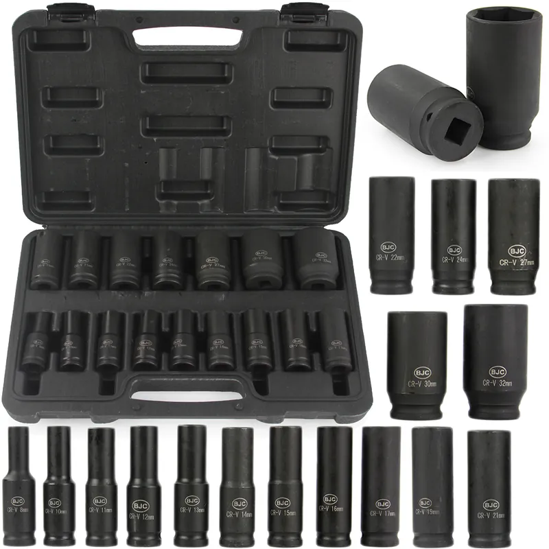 - Zawiera sześciokątne nasadki udarowe krótkie i długie w popularnych rozmiarach od 10 do 32 mm.