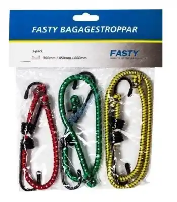 Zestaw 3 pasków elastycznych o średnicy 6 mm pomocnych w zabezpieczaniu bagażu podczas transportu. Na końcach znajdują się haczyki. Paski po naciągnięciu wydłużają się mniej więcej dwukrotnie.