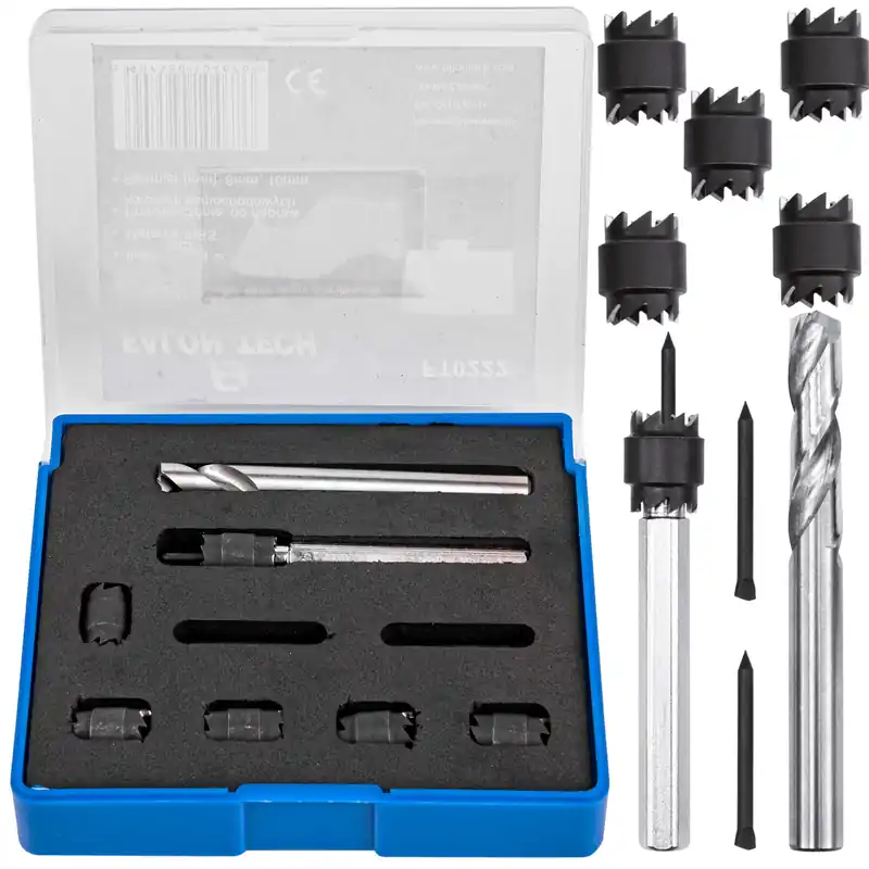 Zawiera 6 dwustronnych frezów koronkowych, uchwyt mocujący, 3 trzpienie ustalające oraz specjalne wiertło HSS 8 mm.