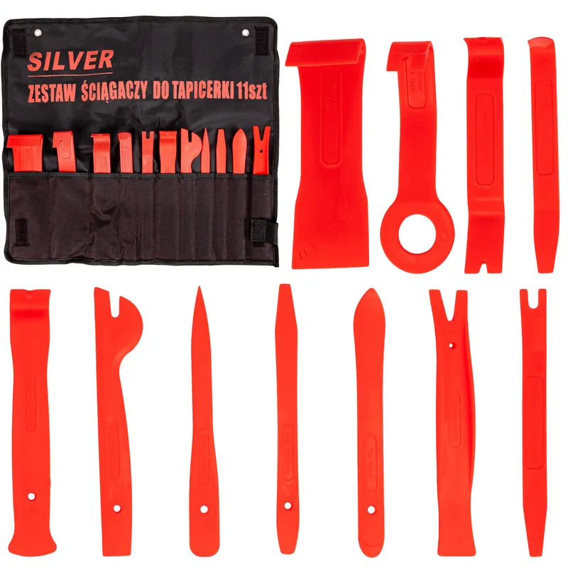 - Ściągacze wykonane są z utwardzonego nylonu, posiadają specjalne profile umożliwiające użycie dźwigni przy demontażu spinek tapicerskich.